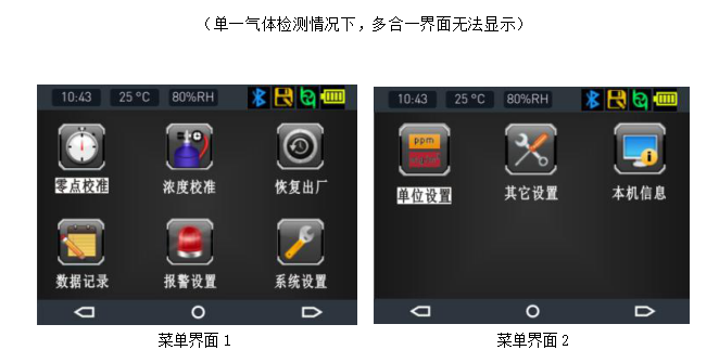 ●2.31英寸高清彩屏顯示實(shí)時(shí)濃度、報(bào)警、時(shí)間、溫度、濕度、存儲(chǔ)、通信、電量、充電狀態(tài)等信息,菜單界面采用高清仿真圖標(biāo)顯示各個(gè)菜單的功能名稱