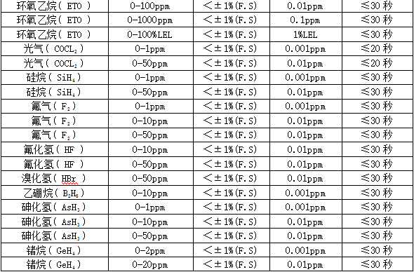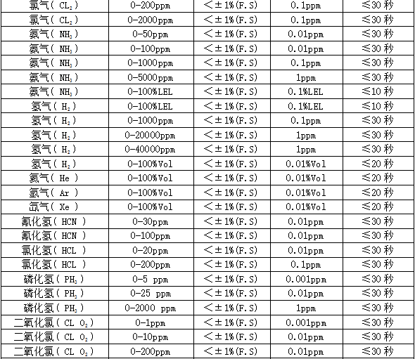 分 辨 率:0.01ppm或0.001ppm(0~10 ppm),0.01ppm(0~100 ppm),0.1ppm(0~1000 ppm),1ppm(0~1000 ppm以上),0.01毫克/升(0~200%毫克/升),0.1%LEL,0.01%,0.001%Vol