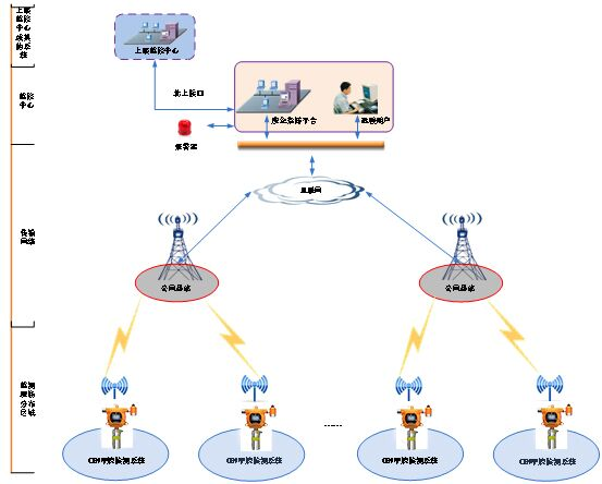 系統(tǒng)由前端監(jiān)測(cè)設(shè)備、傳輸網(wǎng)絡(luò)、后端應(yīng)急管理平臺(tái)等組成,實(shí)現(xiàn)在線(xiàn)實(shí)時(shí)監(jiān)測(cè)。用戶(hù)可使用移動(dòng)終端,電腦查看監(jiān)控中心數(shù)據(jù)。